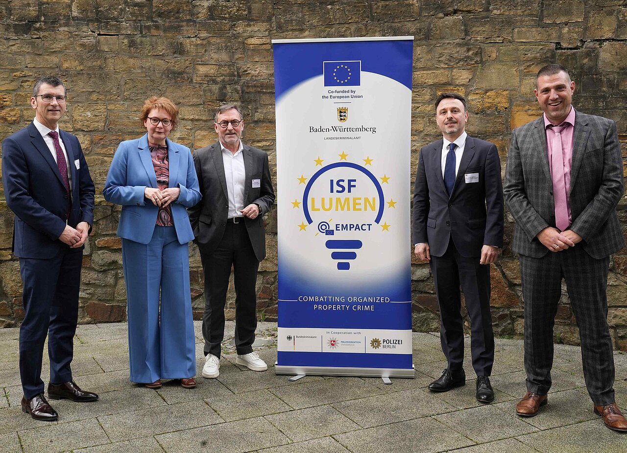 V. l. n. r.: Friedo de Vries (Leiter LKA Niedersachsen), Daniela Behrens (Ministerin für Inneres und Sport Niedersachsen), Michael Maßmann (Polizeipräsident Polizeidirektion Osnabrück), Jochen Katzmann (Vizepräsident LKA Baden-Württemberg), Arne Hermann (ISF LUMEN-Projektleiter, LKA Baden-Württemberg) [Quelle: Polizei Osnabrück]